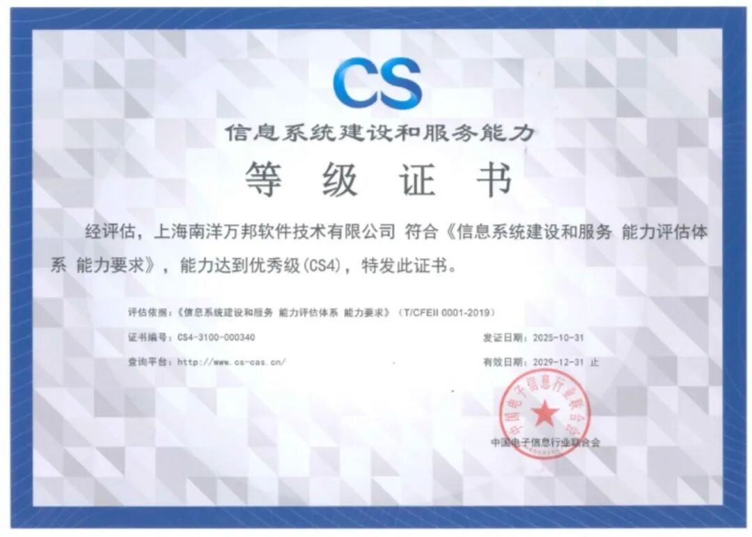 近日,云赛智联(600602)旗下企业上海南洋万邦软件技术有限公司,顺利通过中国电子信息行业联合会关于“信息系统建设和服务能力”的评估工作,取得“信息系统建设和服务能力优秀级(CS4级)”认证。